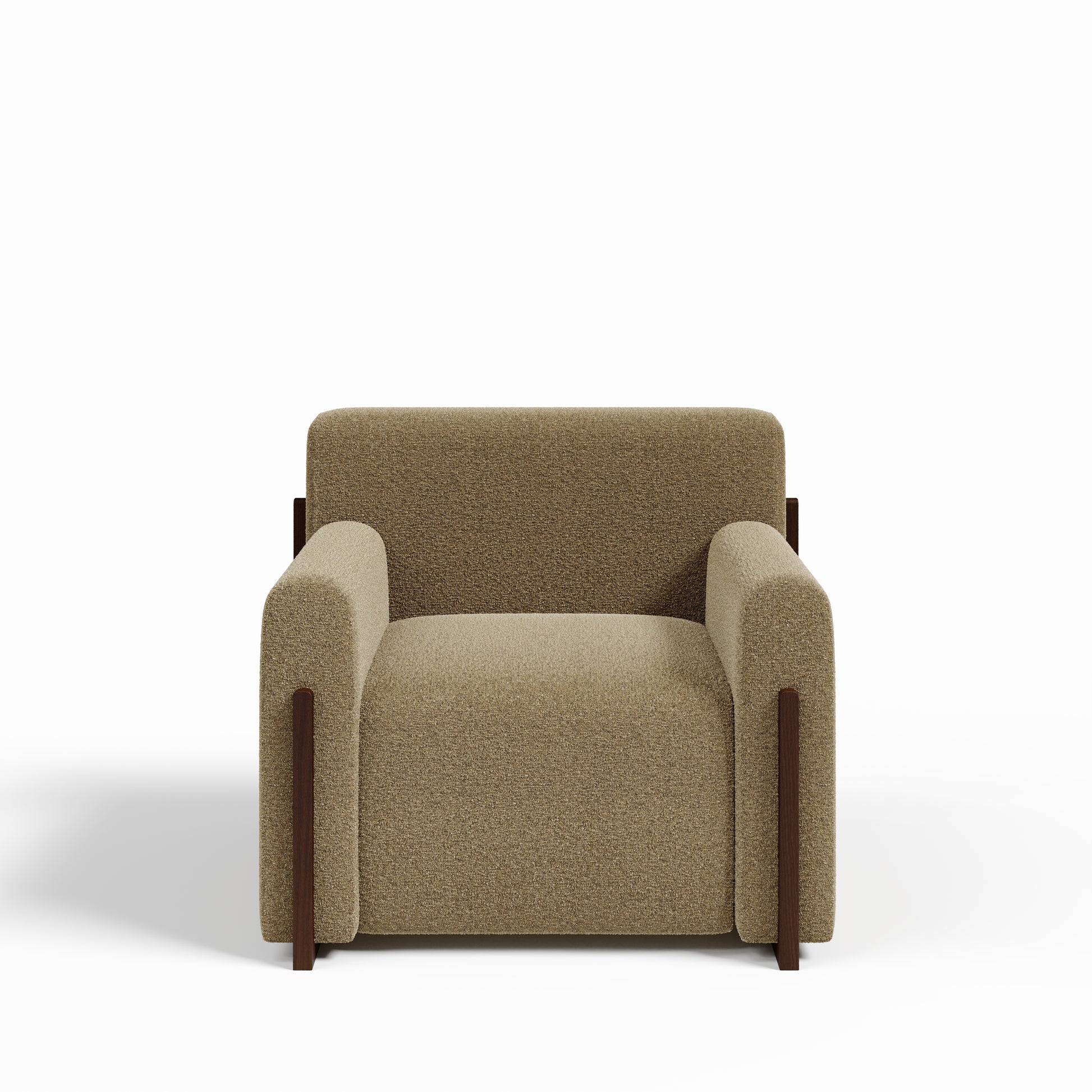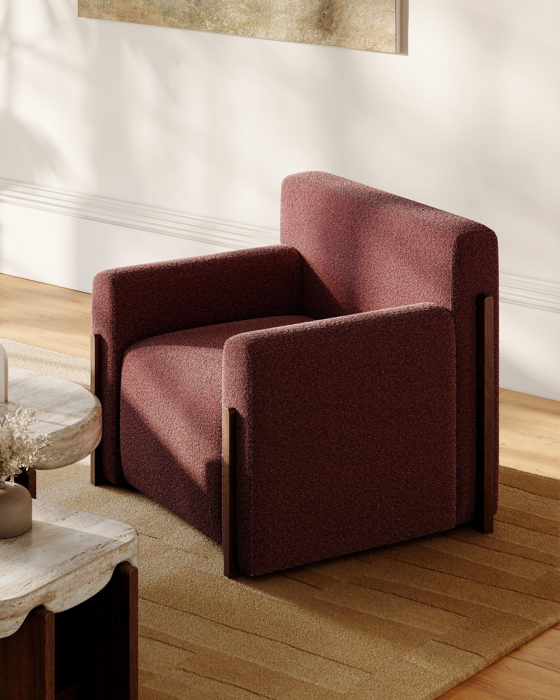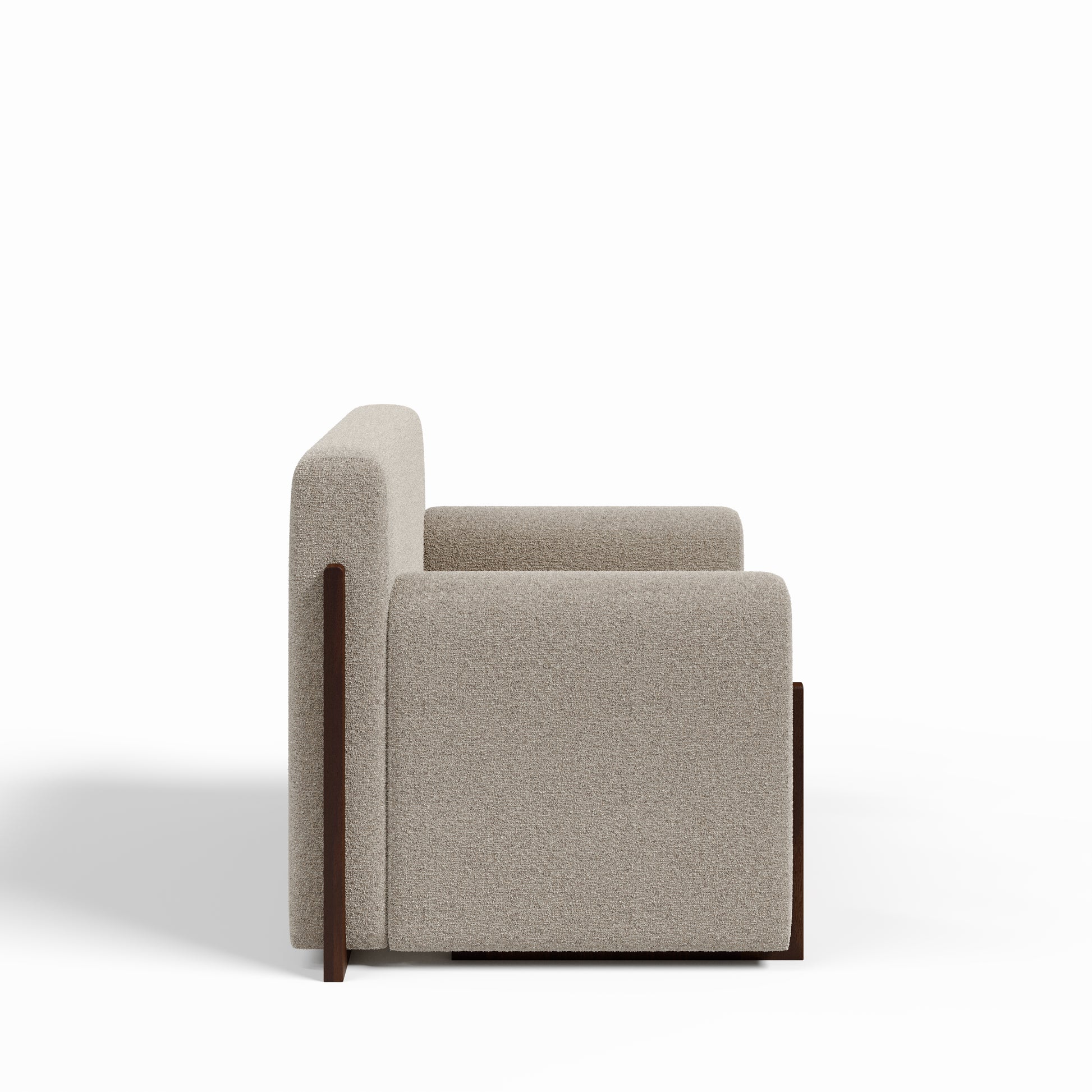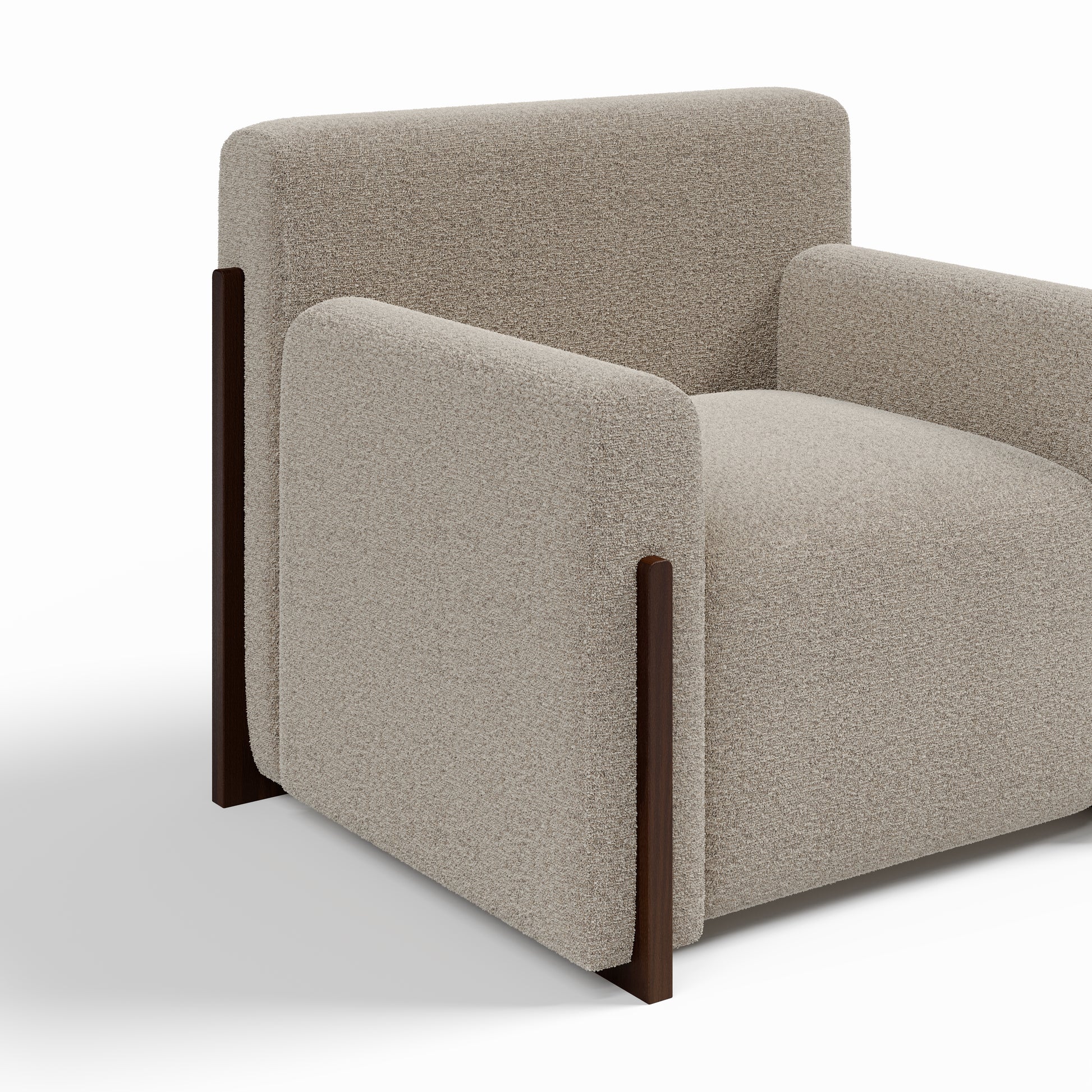 The Bombay Arm Chair is sculpted with bold planes and generous proportions. Its deep seat and enveloping arms create a sense of refuge, while vertical wooden accents introduce rhythm and grounding. With a form that feels architectural yet soft, it anchors a room with quiet confidence.