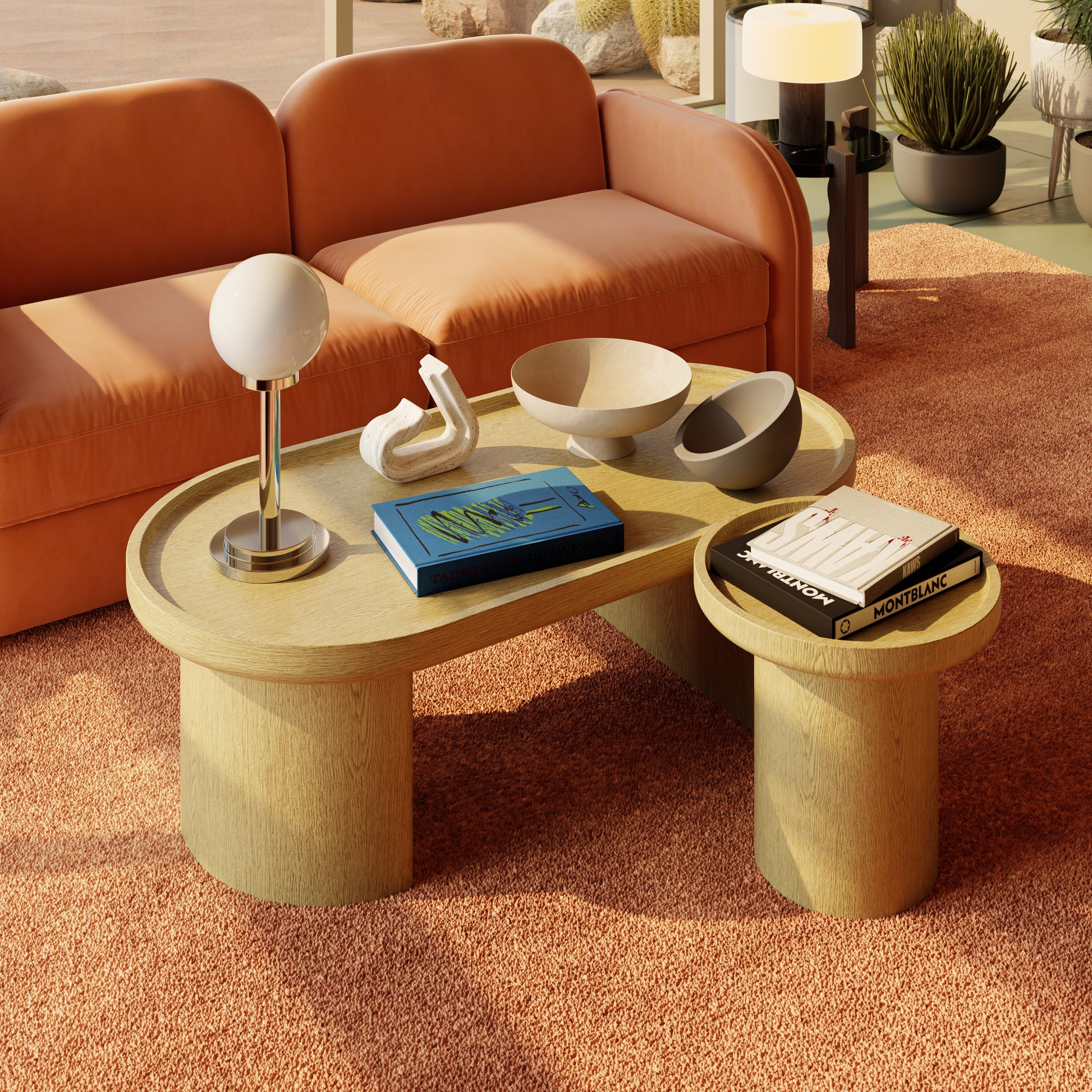The Como Coffee Table blends softness with structure. Its dual-surface design layers an elongated oval with a raised circular tier, resting on solid cylindrical bases. The natural oak finish emphasizes its sculptural simplicity, making it a functional centrepiece with an architectural calm.