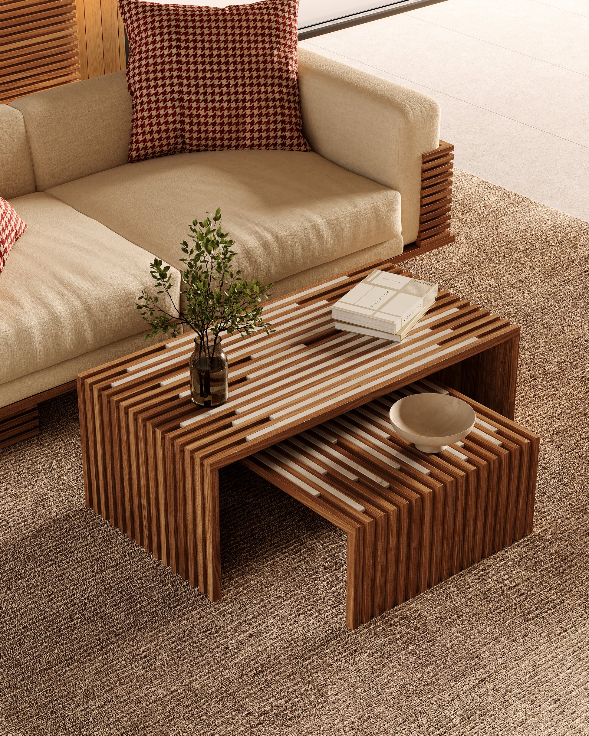 The Linea Coffee Table layers structure and lightness through its wooden linear accented form. A stone surface rests above rhythmic wooden planes, creating depth, shadow, and a sense of movement. Both sculptural and functional, it serves as a centerpiece that highlights the collection’s architectural rhythm.