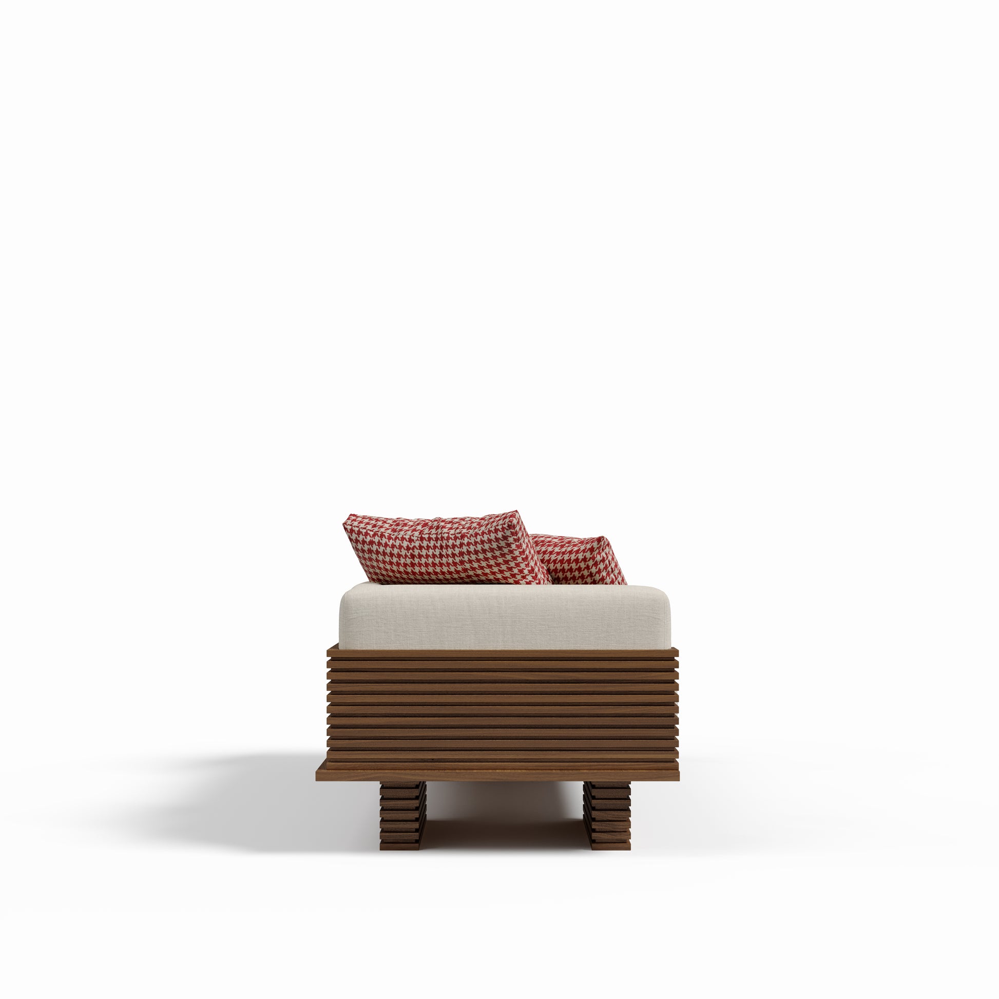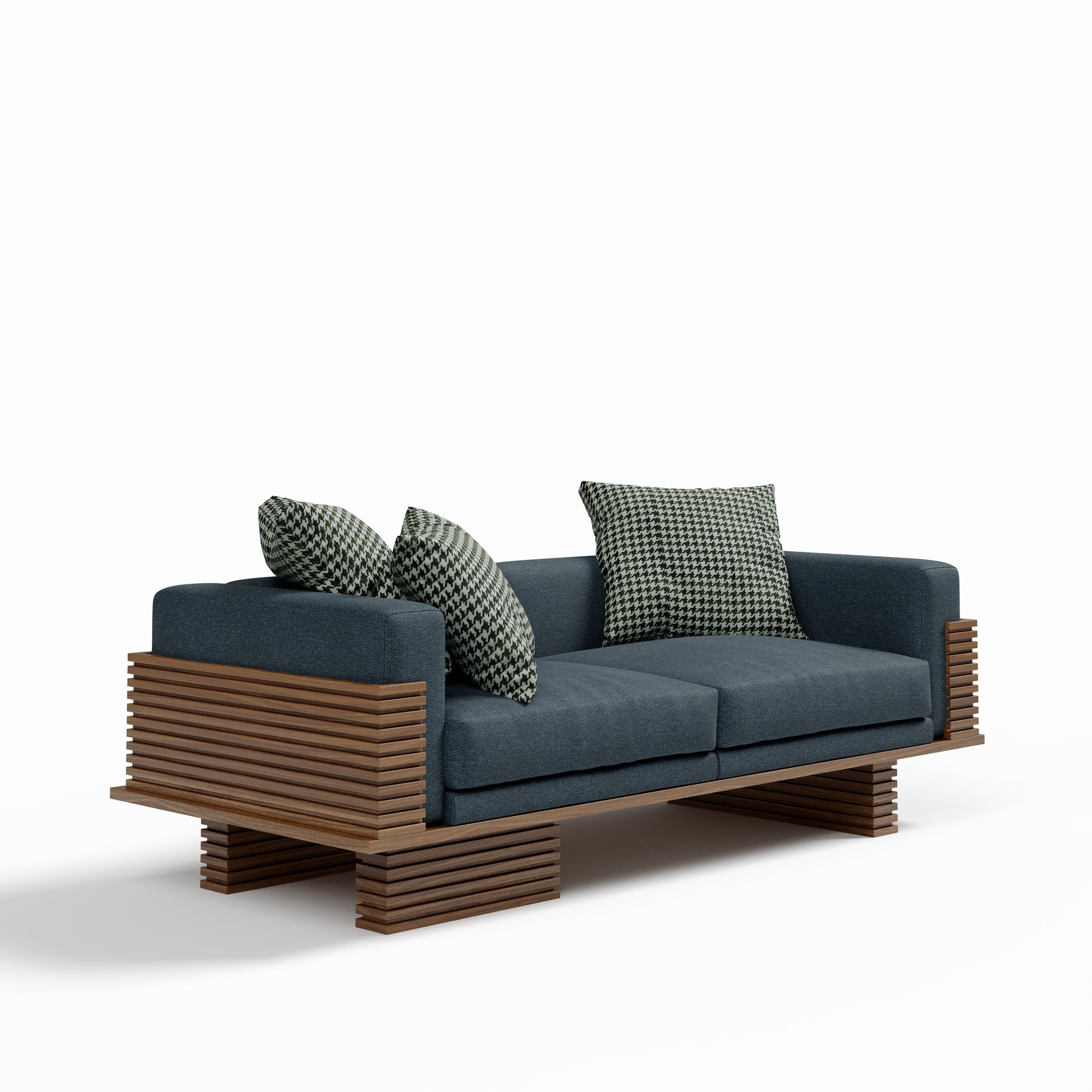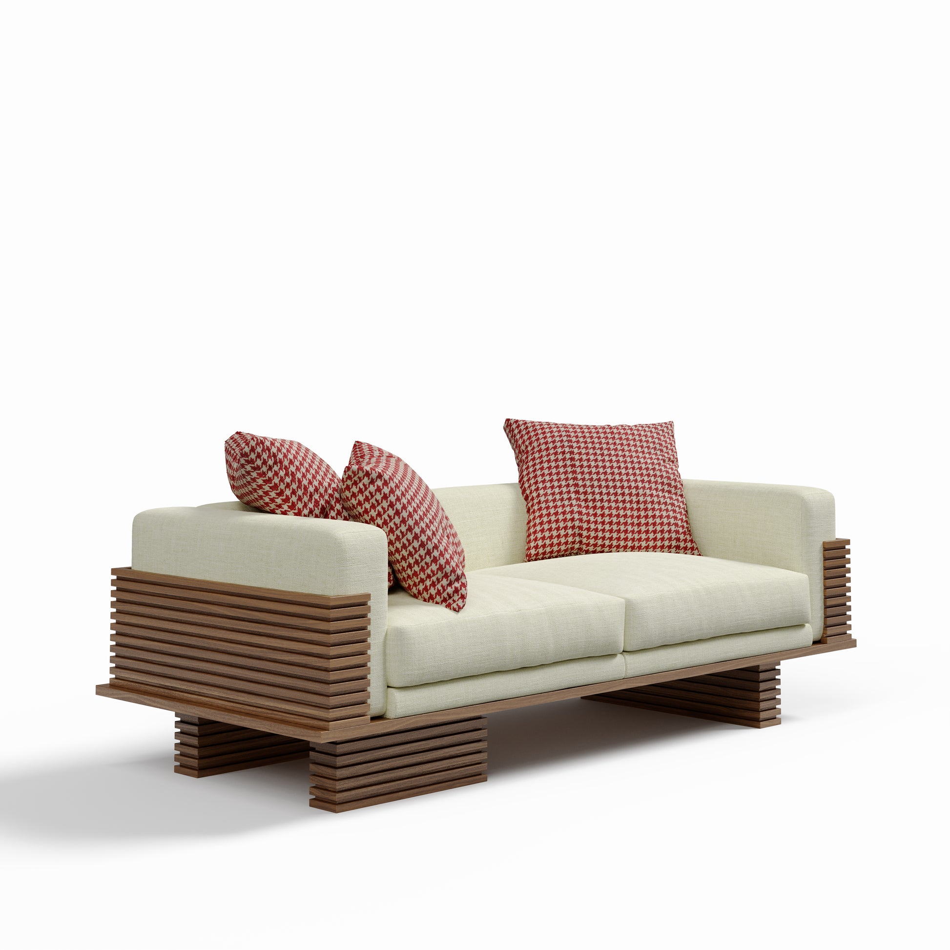 The Linea Sofa translates architectural rhythm into a living piece. Framed in horizontal wooden linear accents, its structure creates depth and shadow while cradling generous upholstered cushions. Elevated yet grounded, it combines strong geometry with softness, making it a striking anchor for contemporary interiors.