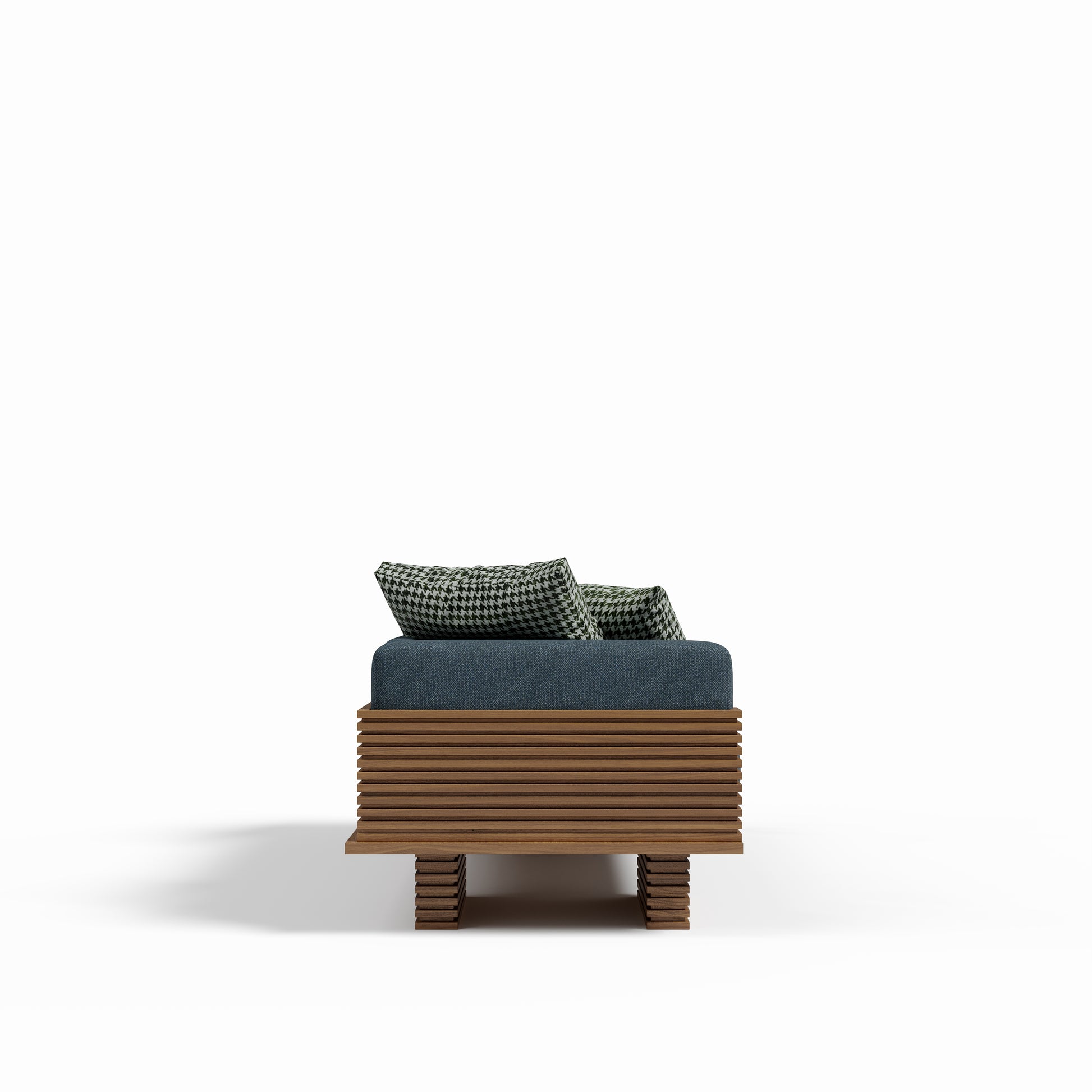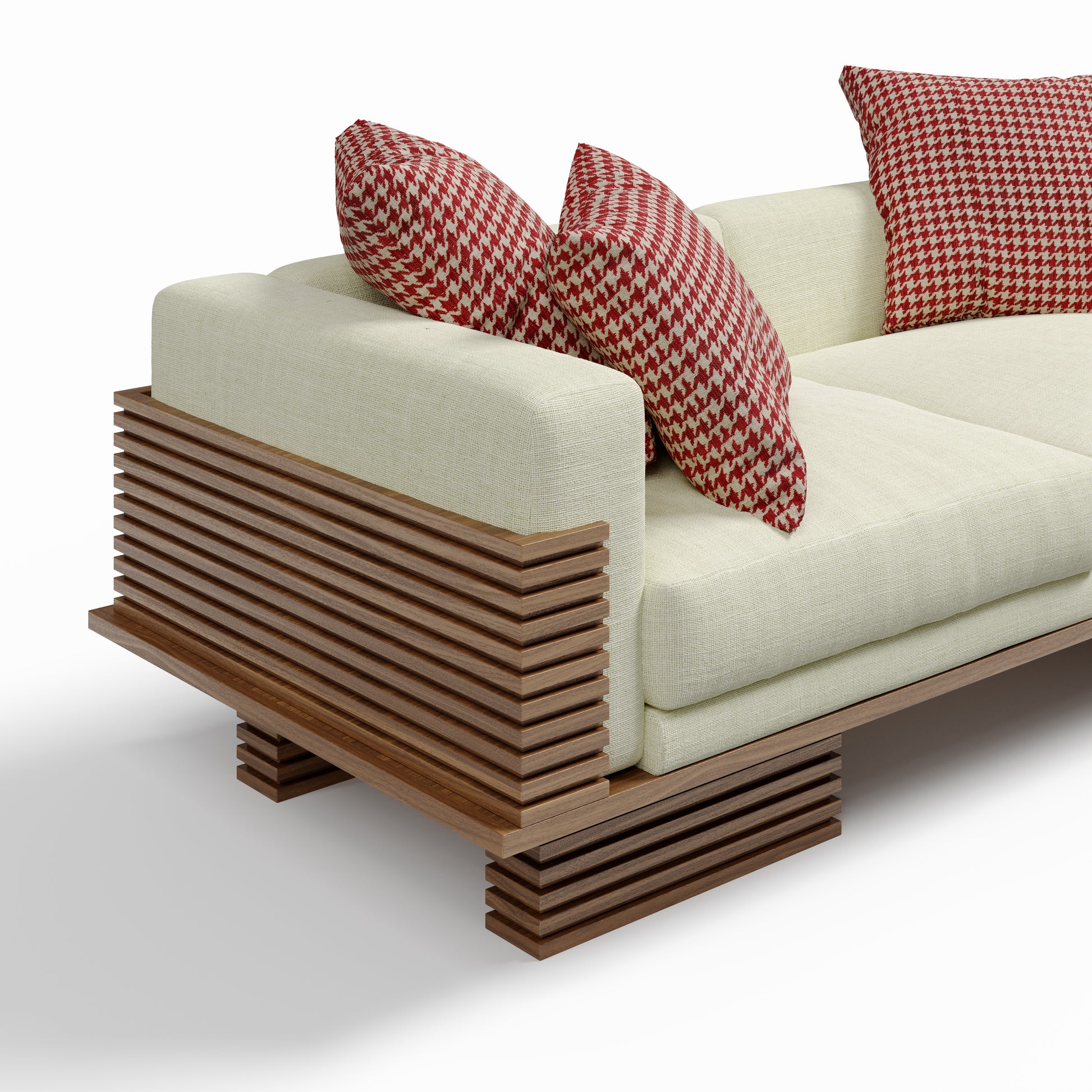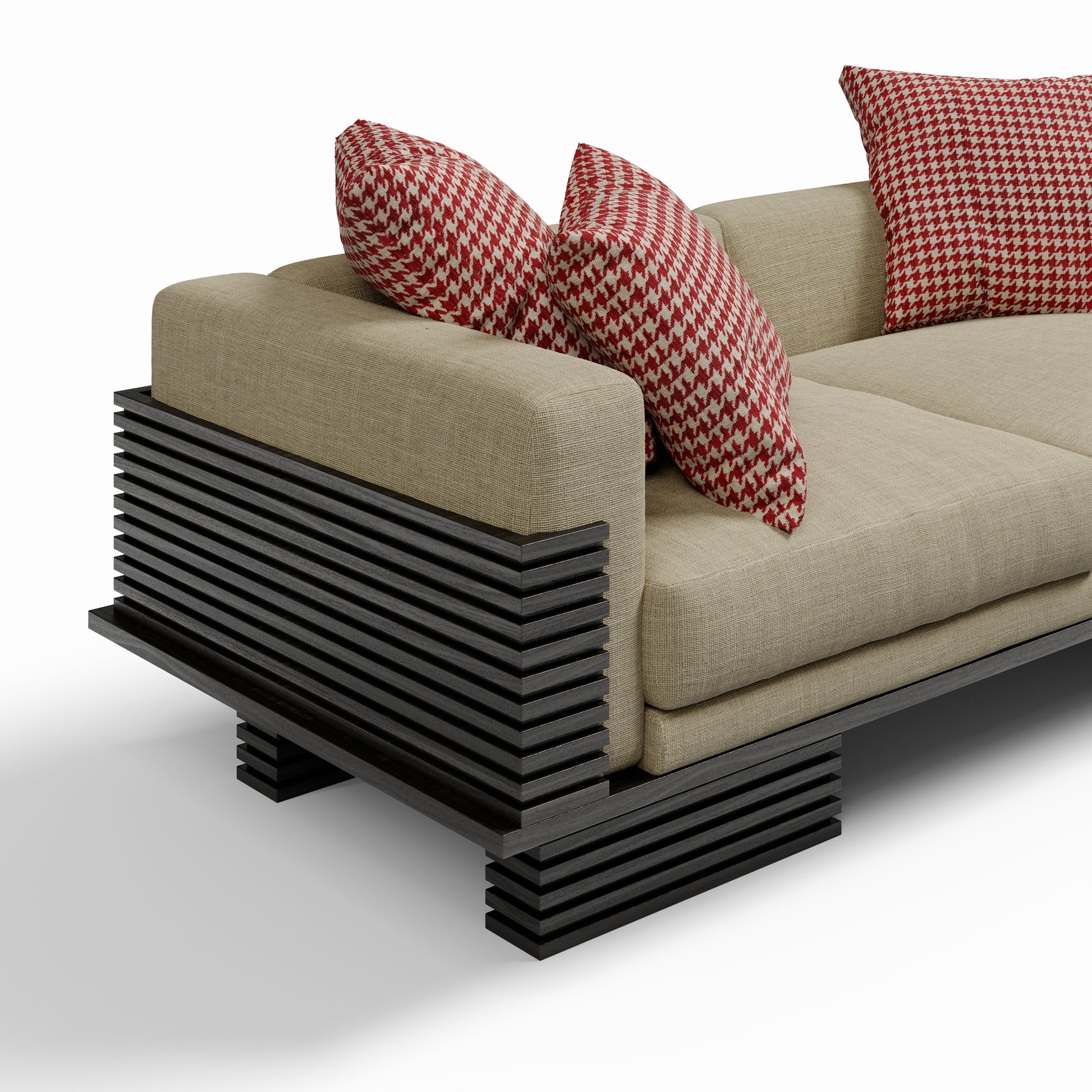 The Linea Sofa translates architectural rhythm into a living piece. Framed in horizontal wooden linear accents, its structure creates depth and shadow while cradling generous upholstered cushions. Elevated yet grounded, it combines strong geometry with softness, making it a striking anchor for contemporary interiors.
